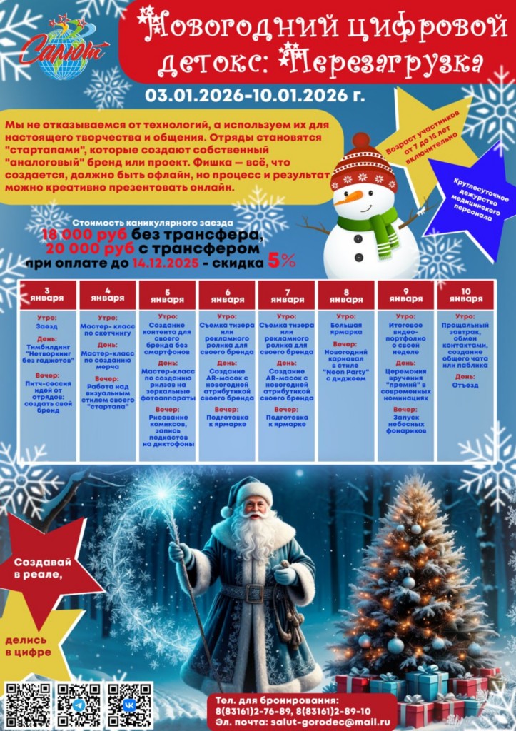 ДСООЦ «Салют» в период зимних каникул с 03.01.2026 по 10.01.2026г. организует смену «Новогодний цифровой детокс: Перезагрузка» с интересной программой активного и увлекательного отдыха детей.